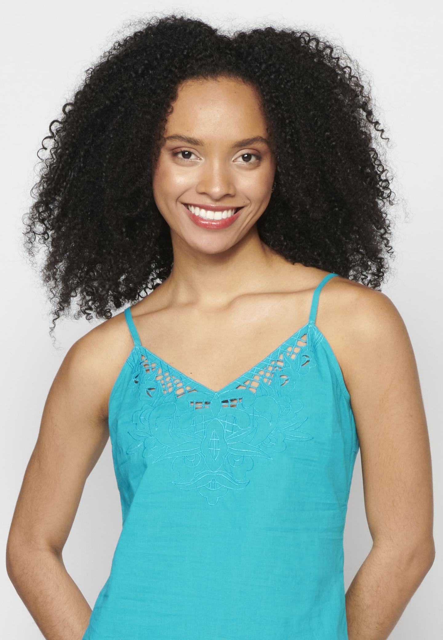 Blusa con tirantes ajustables. Escote de pico. Detalle bordado delantero. Color Azul. Composición 100% Algodón.