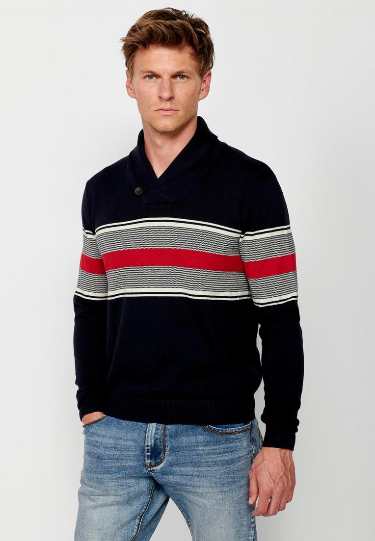 Koroshi | HOMBRE Jersey de punto fino de Algodón con Cuello alto cruzado con cierre de botón y Franjas en el pecho color Navy para Hombre