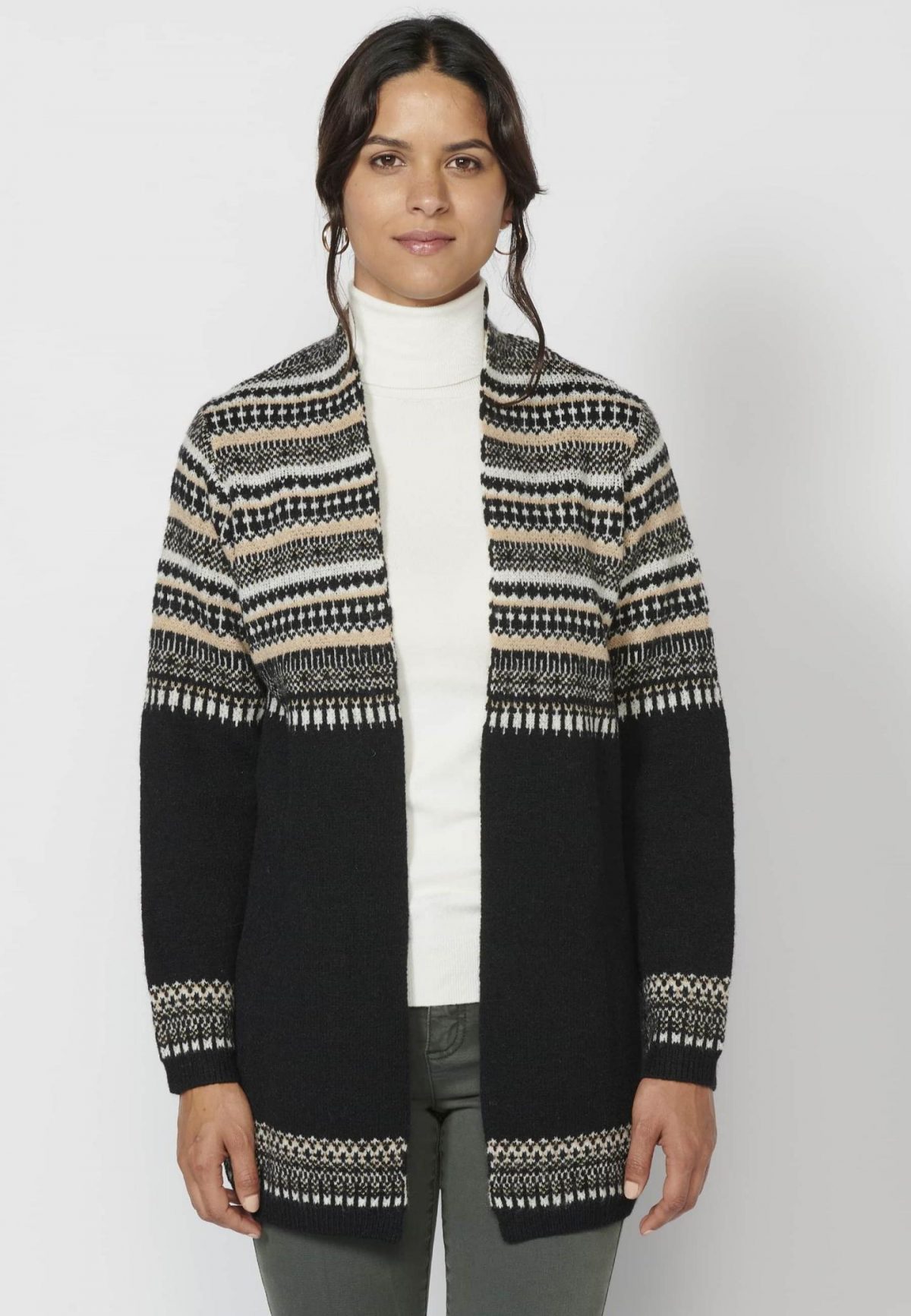 Chaqueta tricot de manga larga. Cuello alto. Detalles tricot en mangas y hombros. Color Negro. Composición: 52% Acrílico 28% Poliamida 20% Poliéster.