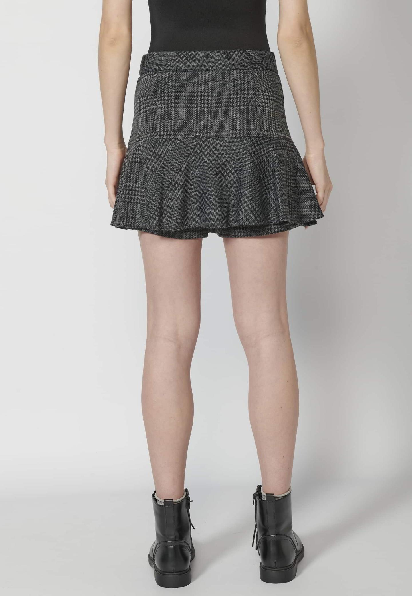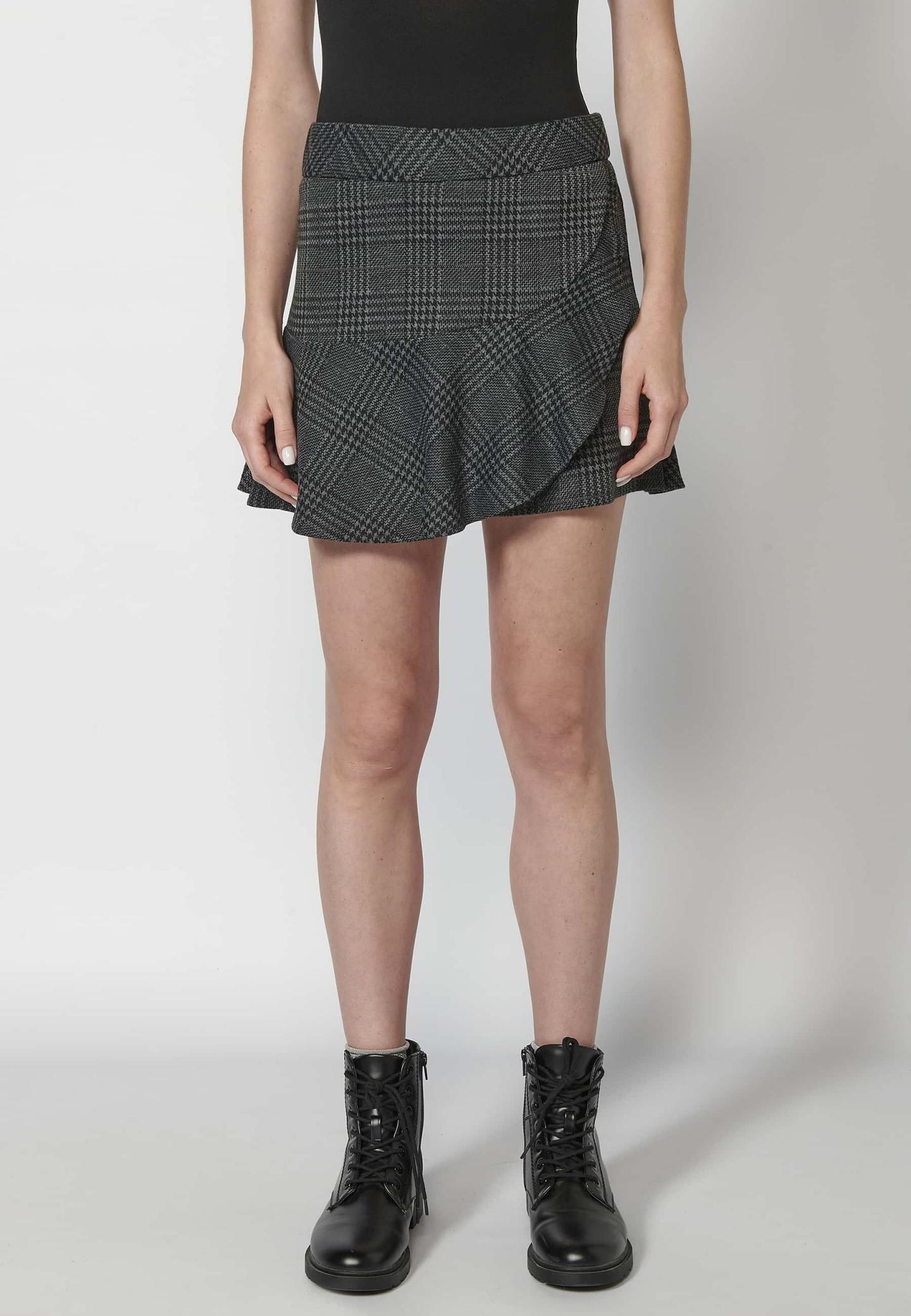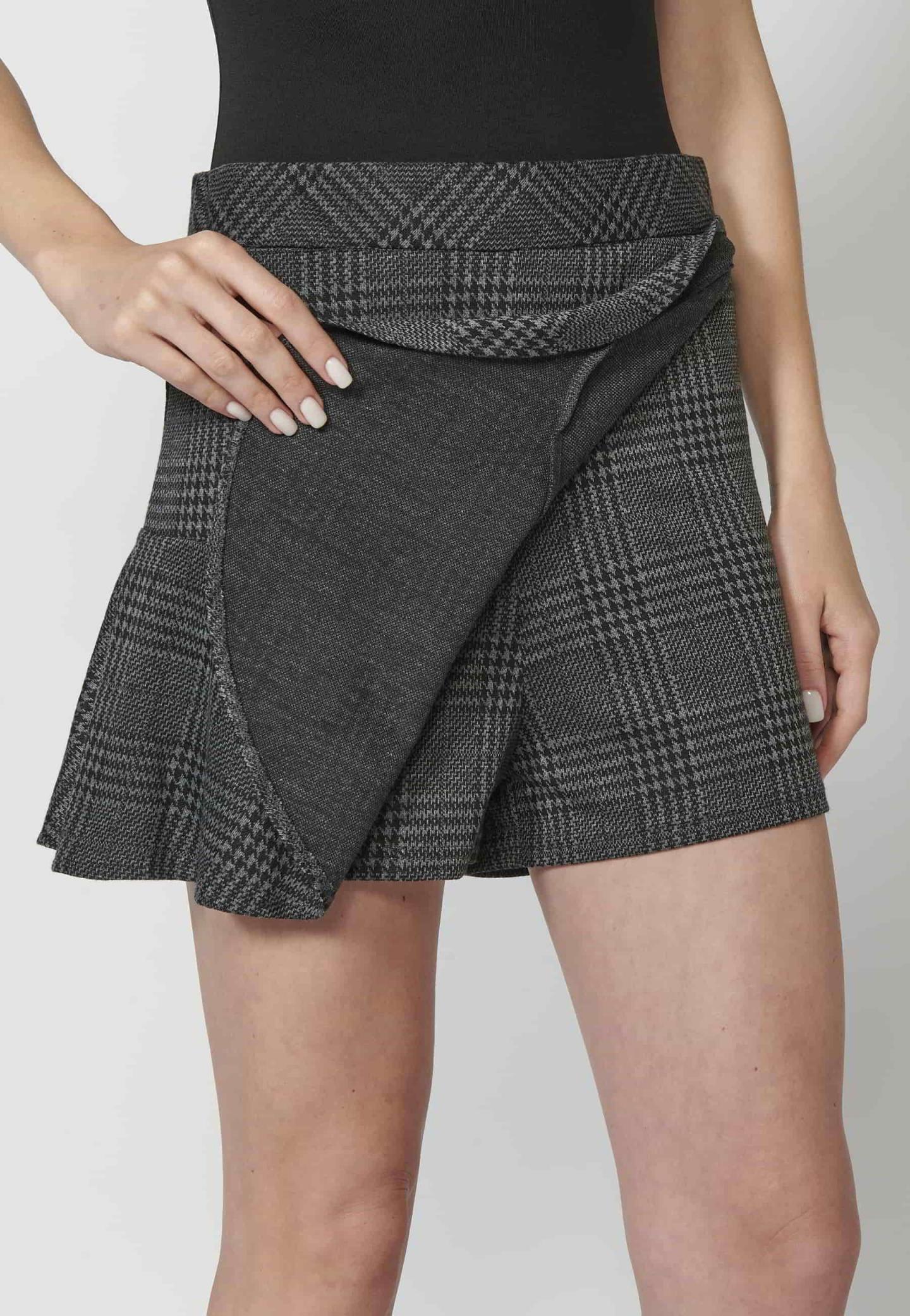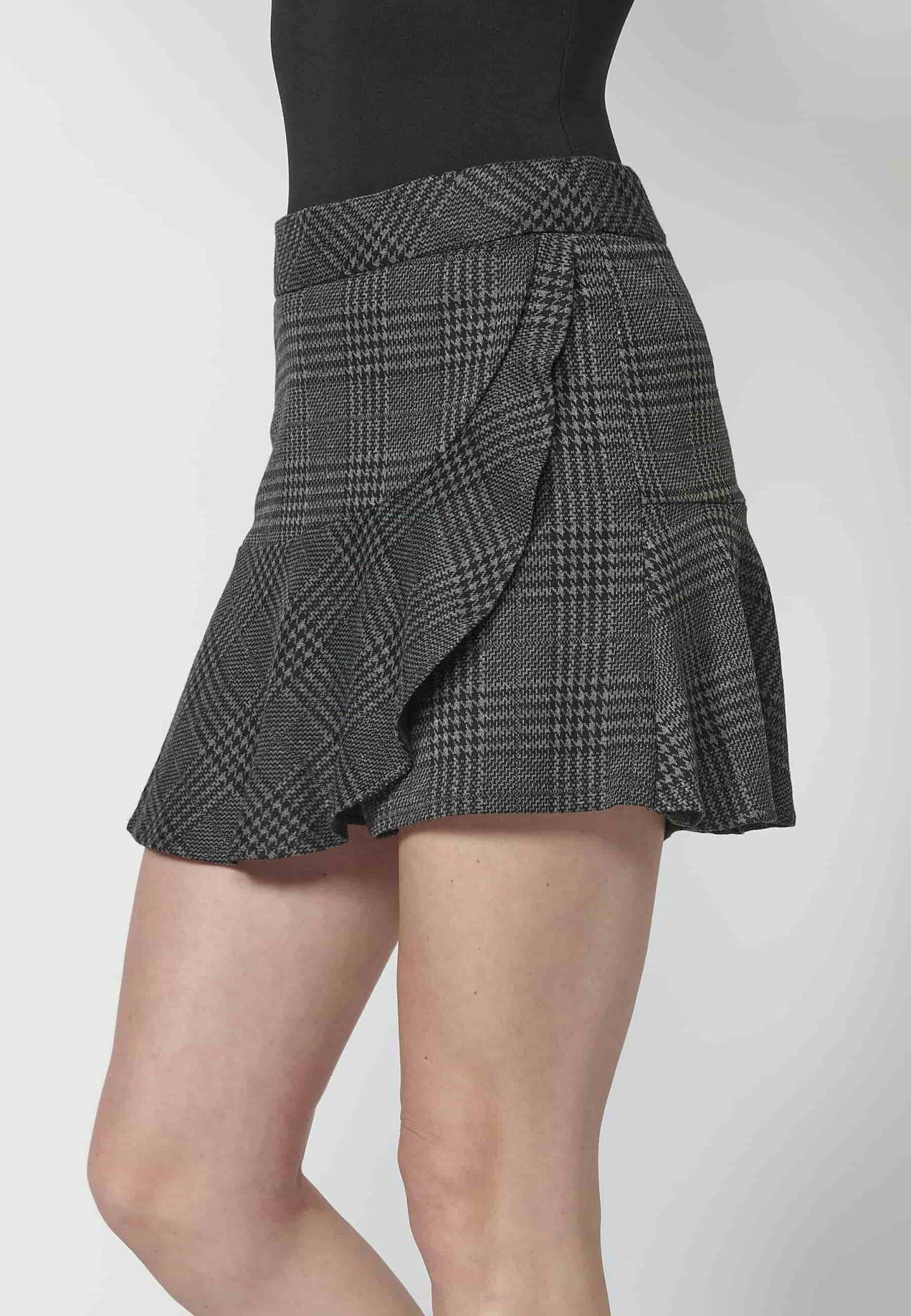 Falda pantalón corto para mujer. Detalle de volante delantero. Estampado a cuadros. Color Negro. Composición 97% Poliéster 3% Elastano
