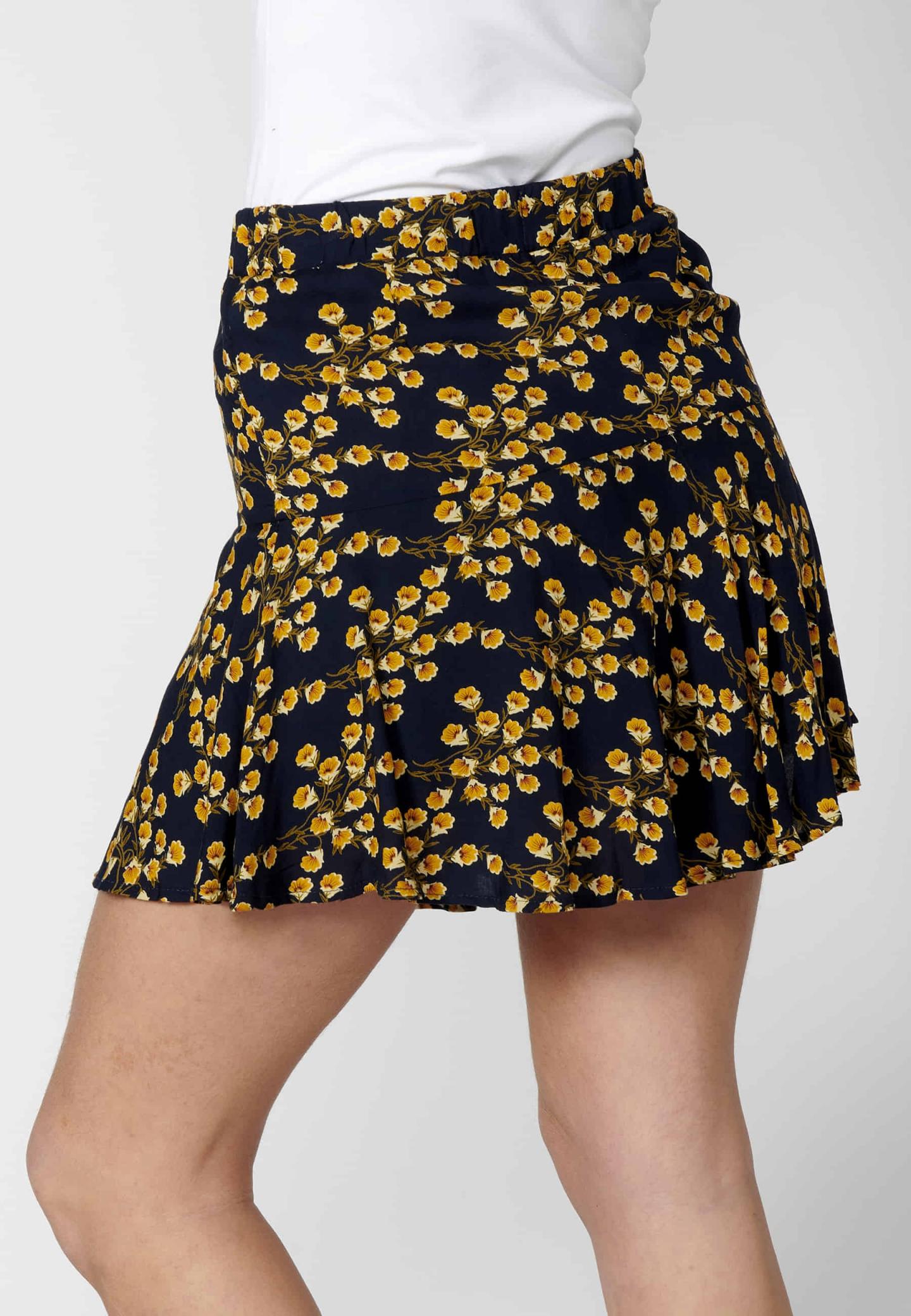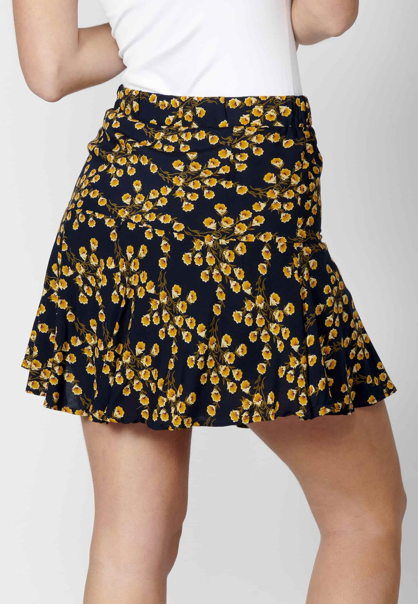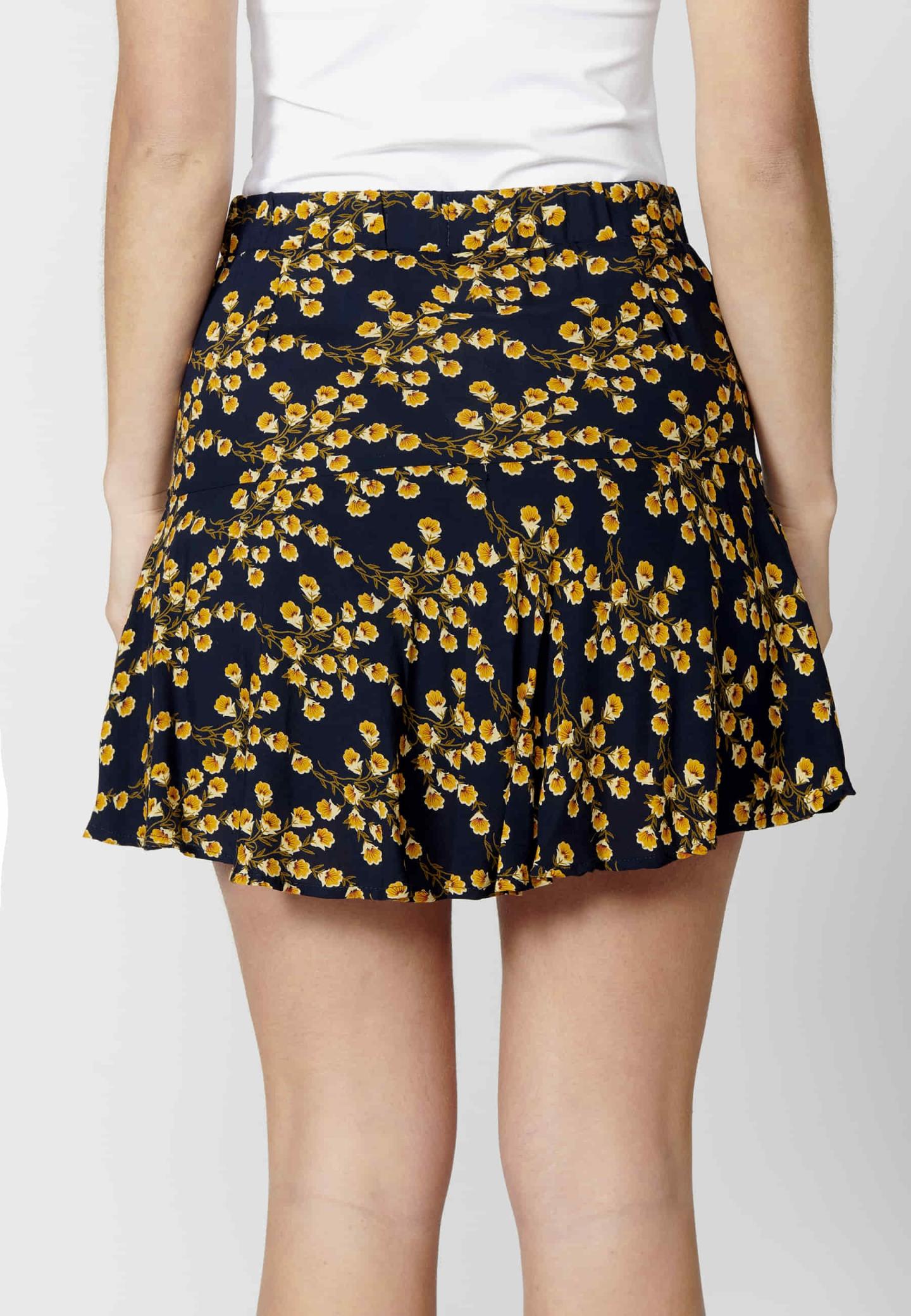 Falda pantalón corta con volante. Estampado floral. Color Navy. Composición 100% Viscosa.
