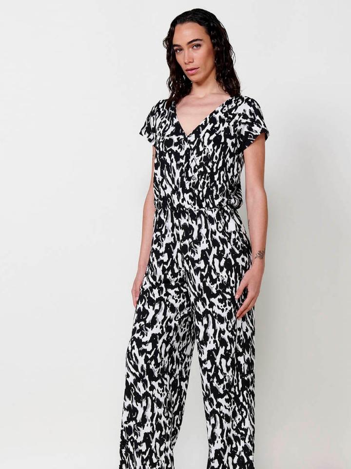 La modelo usa la talla S El mono largo elástico Koröshi en color negro es la prenda perfecta para quienes buscan una opción moderna y cómoda sin perder la elegancia. Con un diseño que se adapta a la figura de manera favorecedora, este mono es ideal para cualquier ocasión en la que quieras lucir sofisticada sin sacrificar el confort. Su escote pico cruzado con botón a presión aporta un toque de frescura y estilo, creando una línea de cuello alargada que resalta tu figura con un aire de elegancia discreta. Una de las características más destacadas de este mono es su cintura con goma interior elástica, que garantiza un ajuste perfecto y cómodo, adaptándose a tu cuerpo sin apretar, lo que te permite moverte con total libertad. Además, su pierna estilo ancho le da un toque moderno y fluido, creando una silueta elegante que es ideal para destacar tu estilo con suavidad y confort. Ya sea para un día de trabajo o para una noche especial, este mono ofrece la versatilidad que necesitas. El estampado abstracto en todo el mono es otro detalle clave que lo convierte en una prenda única. Este patrón aporta dinamismo y modernidad, transformando una prenda básica en una opción con mucha personalidad y estilo. El estampado, a la vez sutil y llamativo, es perfecto para quienes buscan algo diferente, pero que aún mantenga una estética refinada. El detalle de la placa metálica con el logo Koröshi en una parte discreta del mono refleja la exclusividad y la alta calidad de la marca, asegurando que cada prenda que lleves tenga un diseño distintivo y lleno de carácter. Confeccionado en una composición de 98% Poliéster y 2% Elastano, este mono ofrece la combinación ideal de resistencia, elasticidad y suavidad. El poliéster asegura que la prenda se mantenga en excelente estado con el tiempo, mientras que el elastano proporciona la flexibilidad necesaria para que se ajuste perfectamente a tu figura, sin perder la forma ni la comodidad. El mono largo negro Koröshi es la elección perfecta para quienes desean una prenda que combine estilo, confort y versatilidad. Puedes combinarlo con tacones para un look más elegante o con sandalias para un estilo más relajado. Su diseño sofisticado y sus detalles exclusivos lo convierten en una prenda clave para cualquier mujer moderna que busque destacar su estilo personal.