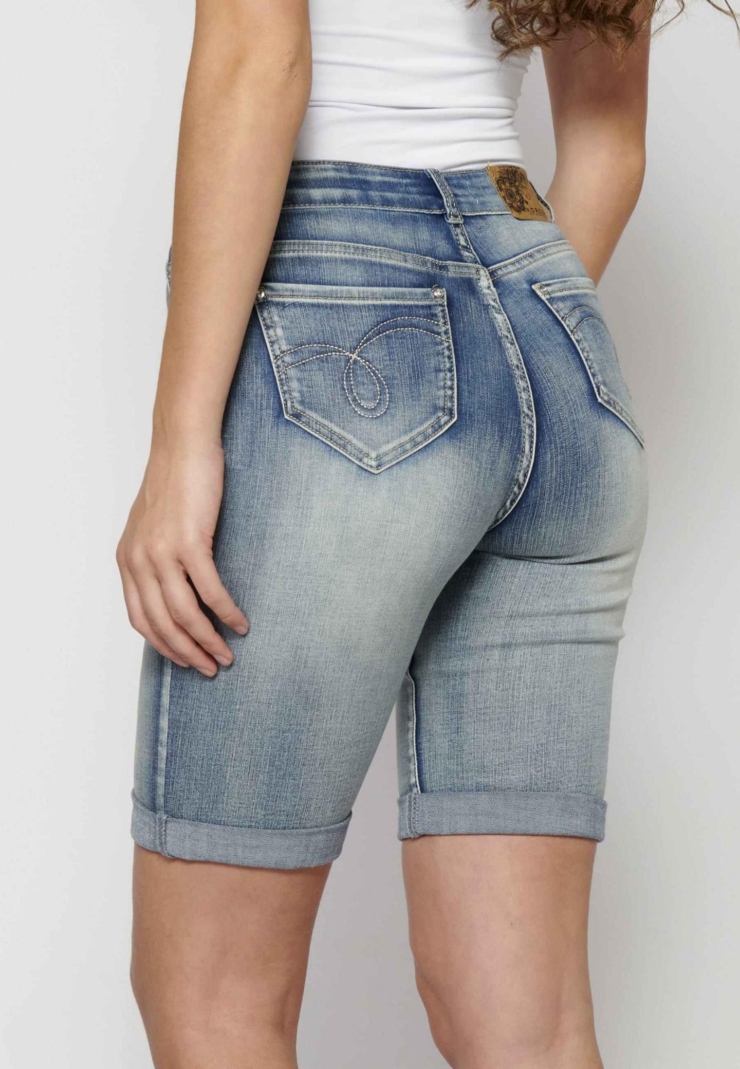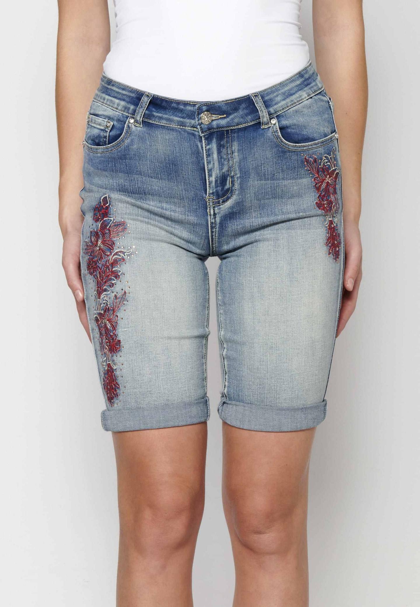 Pantalón short slim. Bordados delantero florales. Cierre delantero con cremallera y botón. Color Azul. Composición 70% Algodón, 28% Poliéster, 2% Elastano