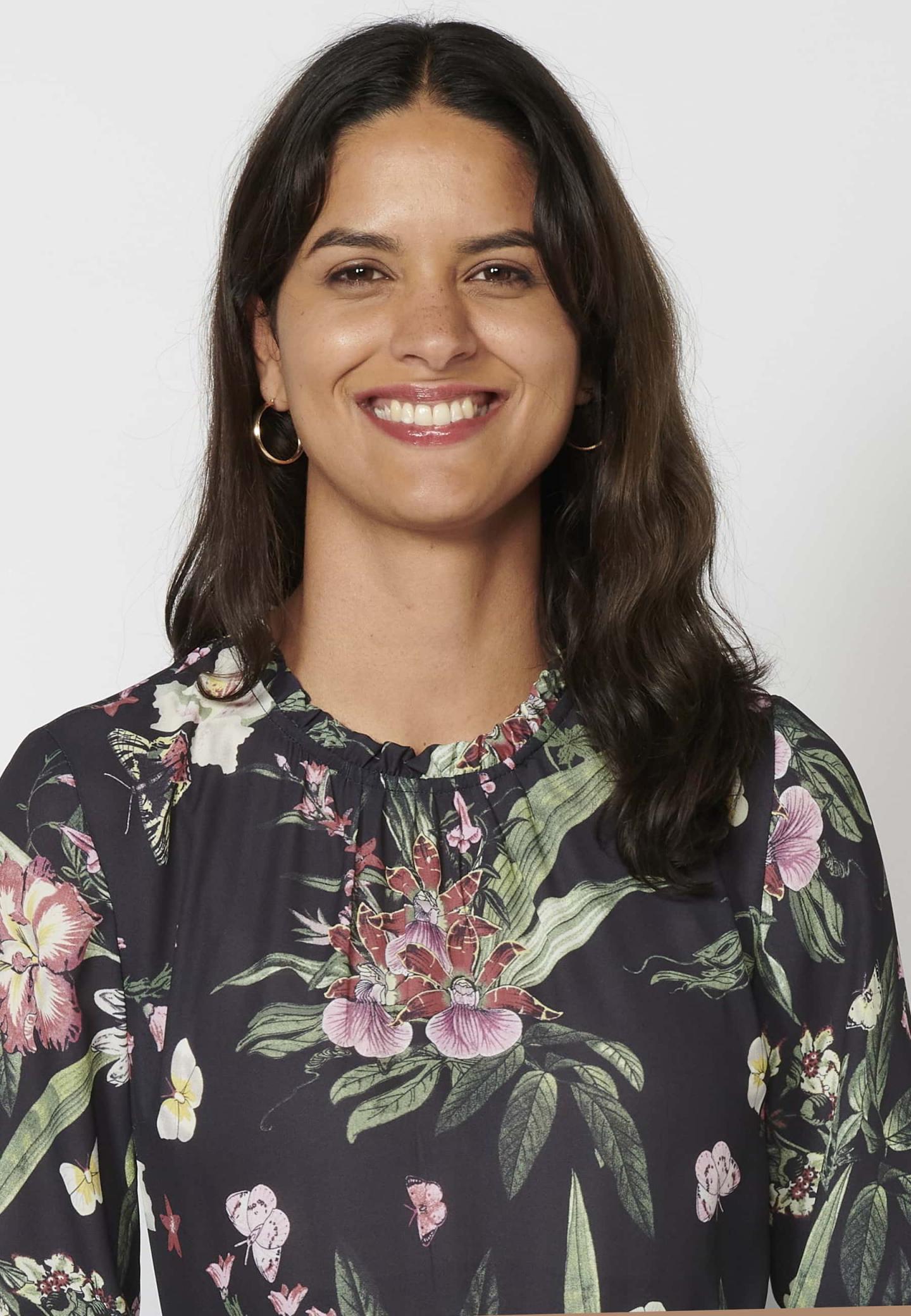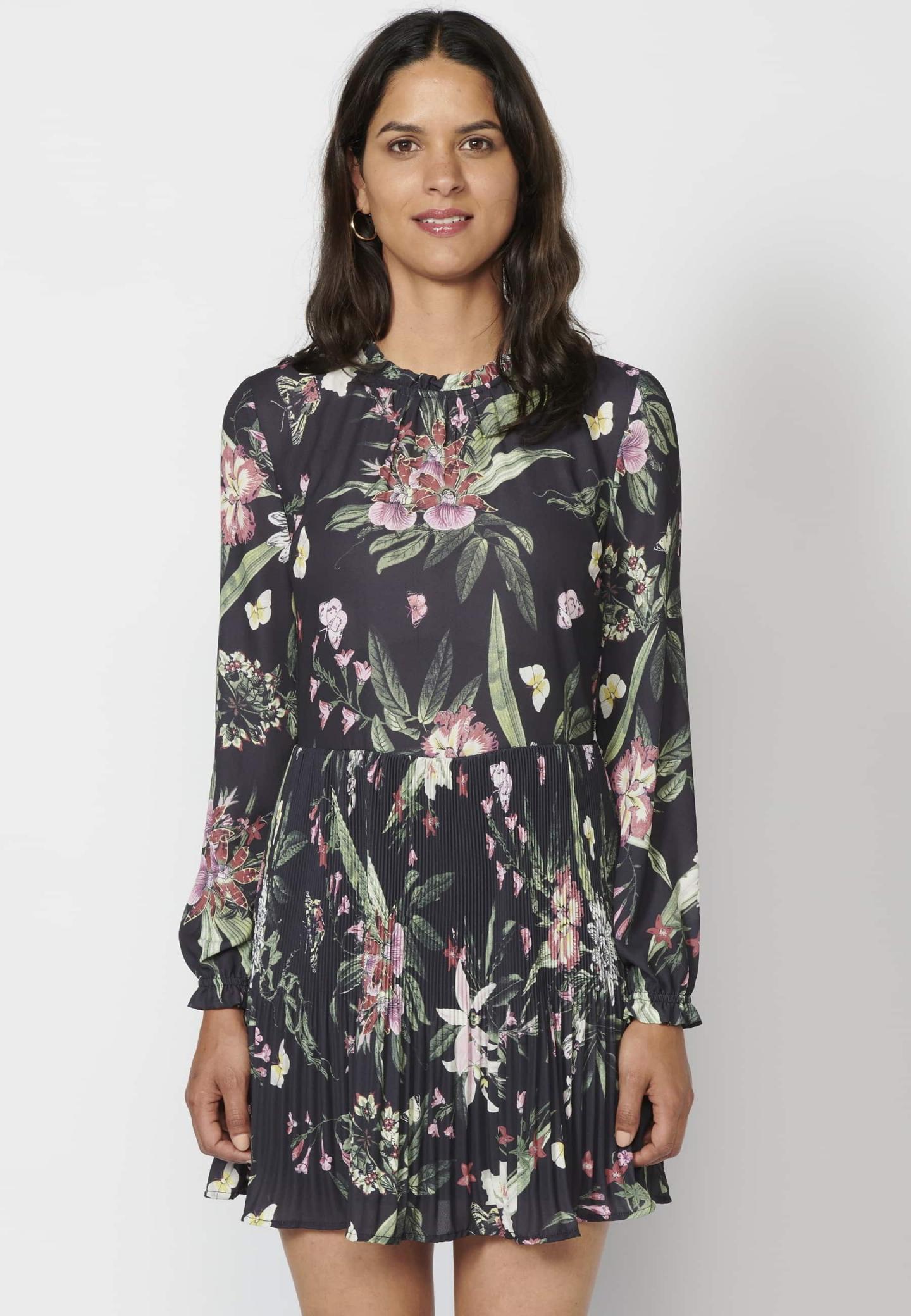 Vestido de manga larga. Cuello redondo con volante. Cierre trasero con cremallera. Falda plisada. Estampado floral. Color Multicolor. Composición: 100% Poliéster.