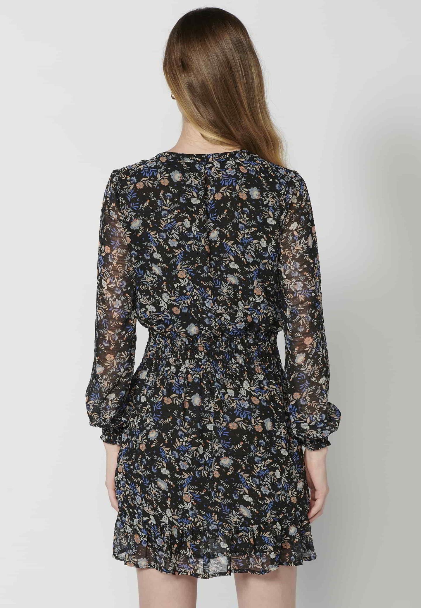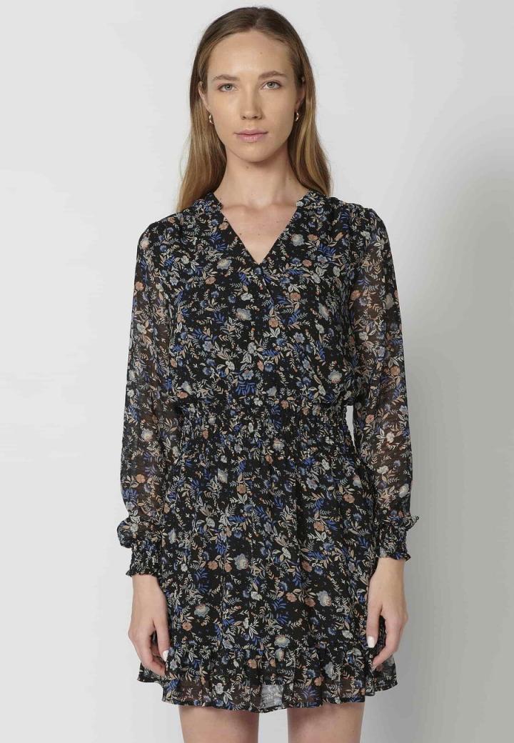 Vestido de manga larga para mujer. Escote de pico cruzado. Manga acabado en goma. Estampado floral multicolor. Composición 100%Poliéster