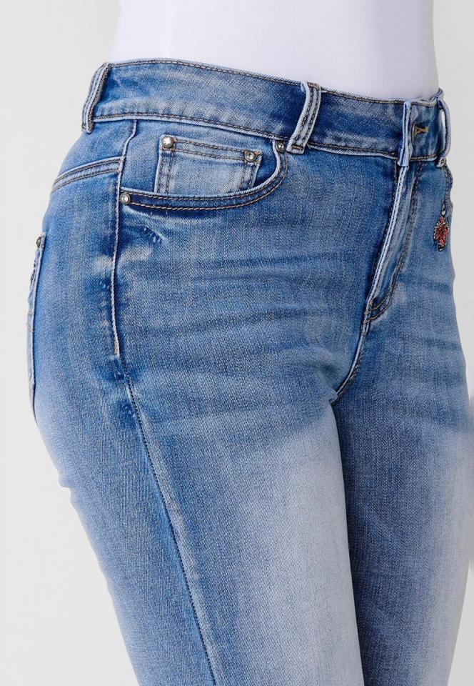 The model is wearing size 36 Discover the straight-leg jeans that add a touch of style and originality to your wardrobe. Designed in a classic blue color with delicate embroidered details of flowers and butterflies, these pants are ideal for the woman who wants to stand out with a sophisticated and feminine look. Made with a composition of 72% cotton, 26% polyester and 2% elastane, these pants offer comfort, resistance and a slight elasticity that ensures a flattering fit. Cotton provides softness and breathability, while polyester guarantees durability and easy maintenance. Meanwhile, elastane allows freedom of movement and a perfect fit to the silhouette. The straight-leg blue jeans with embroidered flowers and butterflies are a versatile piece that adapts to any style. Pair it with elegant blouses and heels for a formal look, or with t-shirts and sneakers for a casual and relaxed outfit. Its detailed embroidery adds an artistic and charming touch that elevates any outfit. The Koröshi brand is known for its commitment to modern design and high quality in every garment. These pants are a clear example of its passion for contemporary fashion, offering a piece that combines practicality and style for today’s woman. Perfect for any season, these long pants are a classic and timeless option that cannot be missing from your wardrobe. Their blue color makes it easy to create combinations with a wide variety of garments and accessories, allowing them to adapt to different occasions and styles. Get the Koröshi straight long jeans with embroidered flower and butterfly details and give your style a touch of elegance and originality. Choose Koröshi and wear a unique, versatile and personality-filled garment!