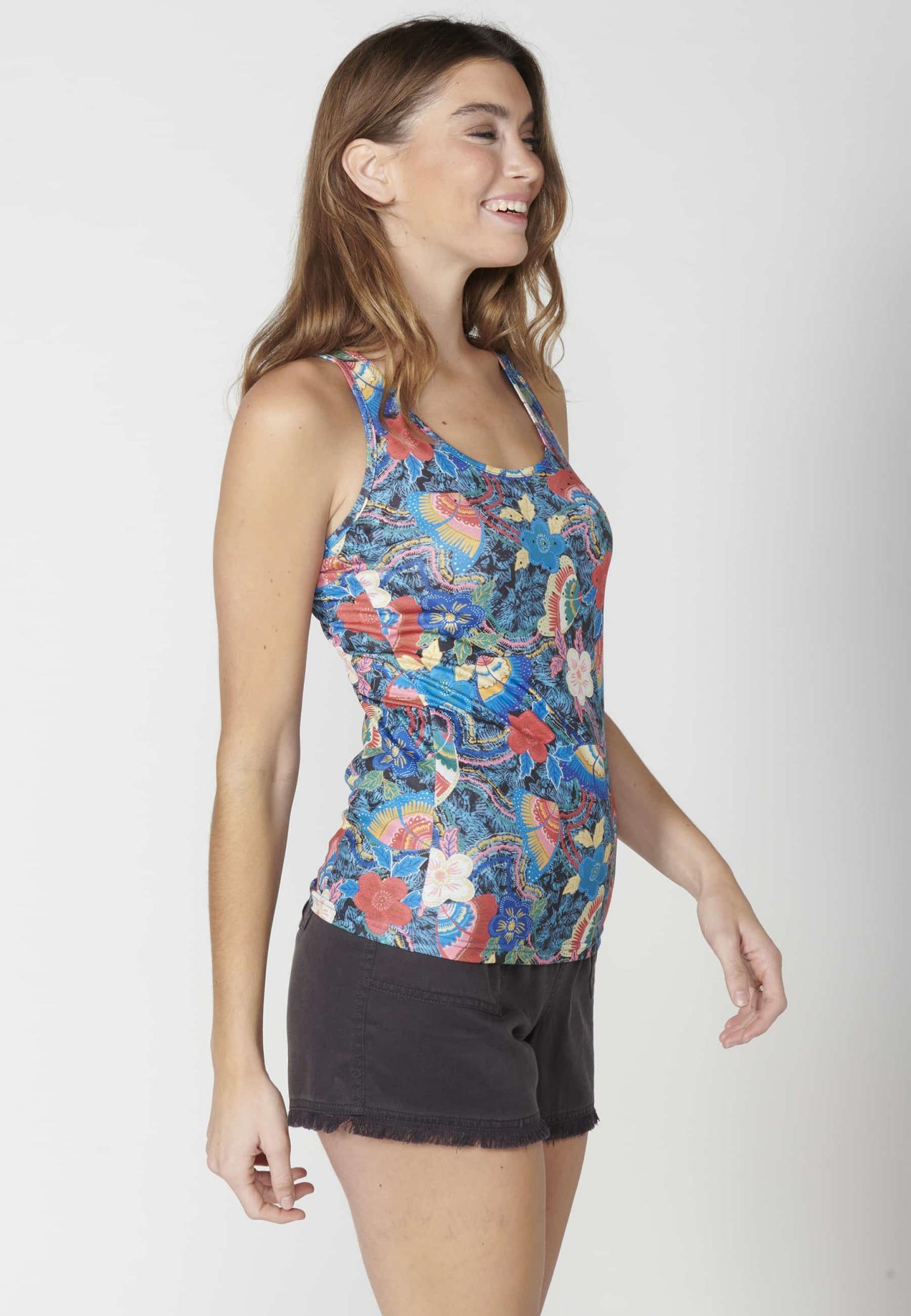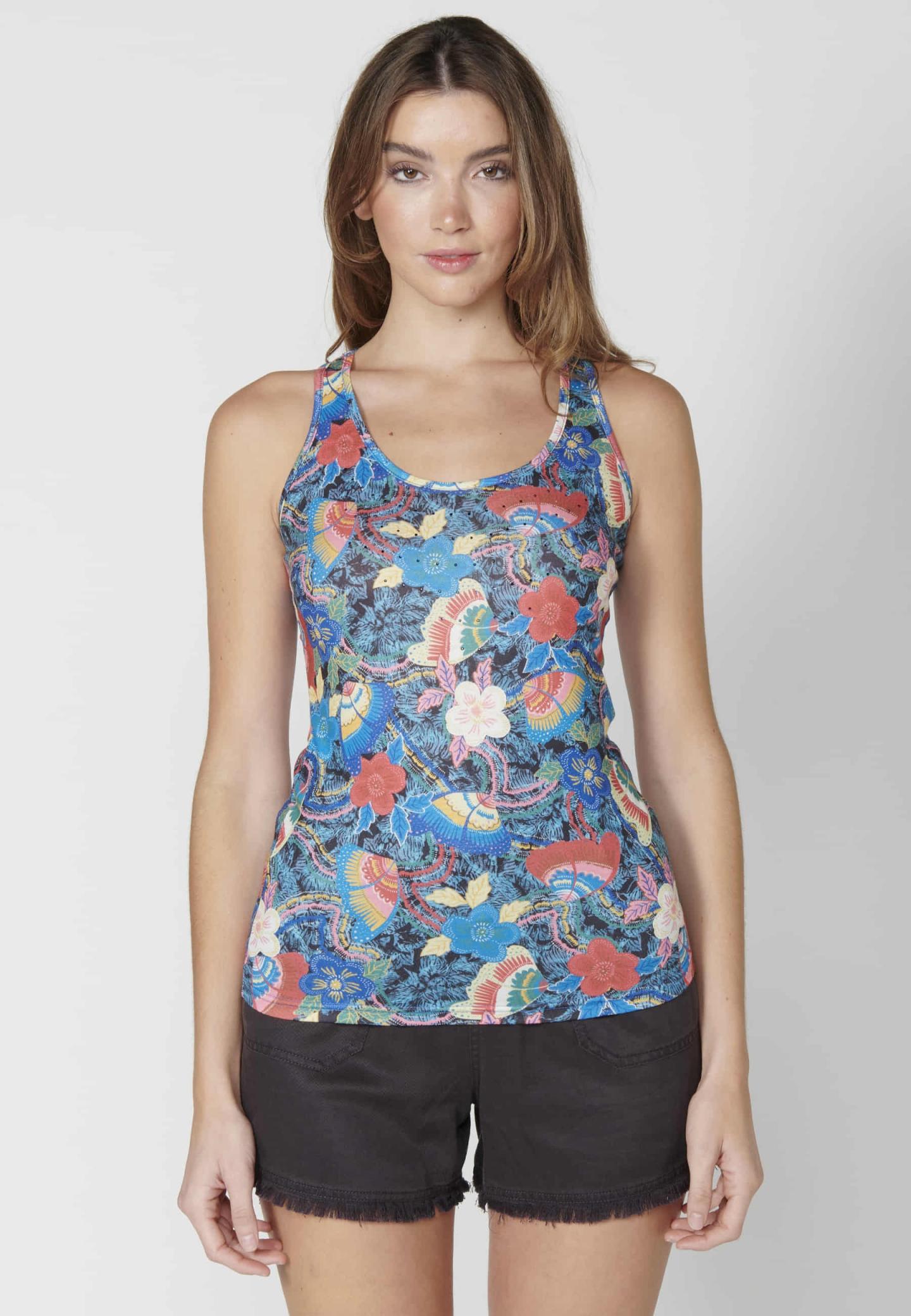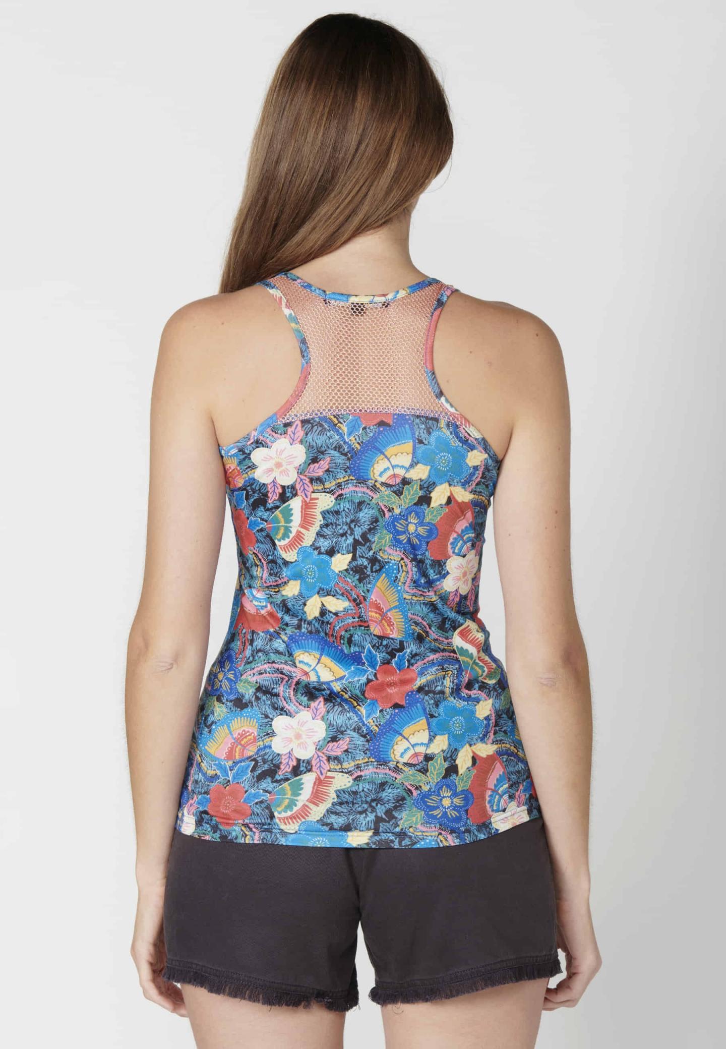 Top sin mangas. Detalle de rejilla trasero. Estampado floral. Color Navy. Composición 95% Poliéster 5% Elastano.