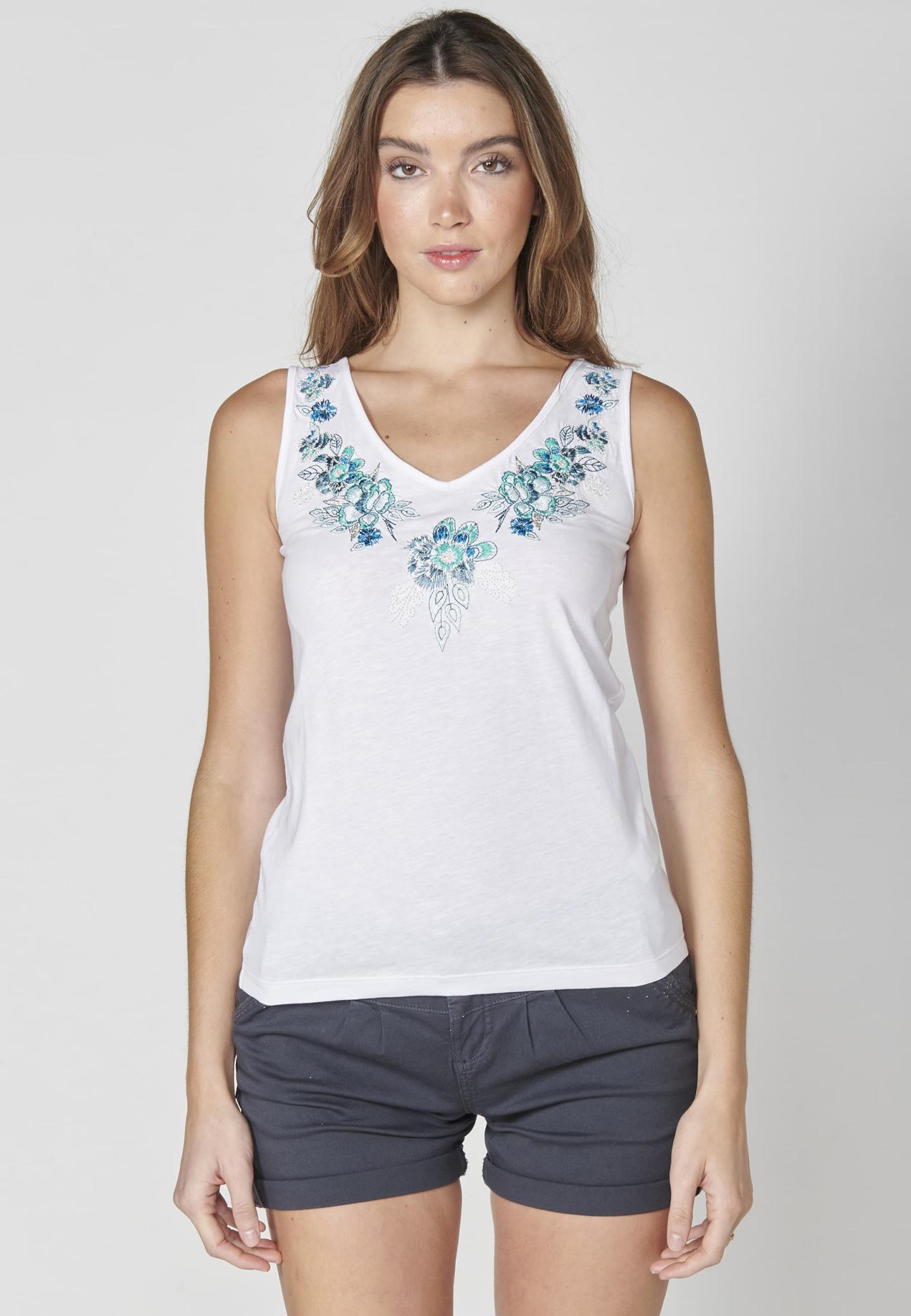 Camiseta sin mangas. Escote de pico. Detalle bordado floral delantero. Color Blanco. Composición 100% Algodón.