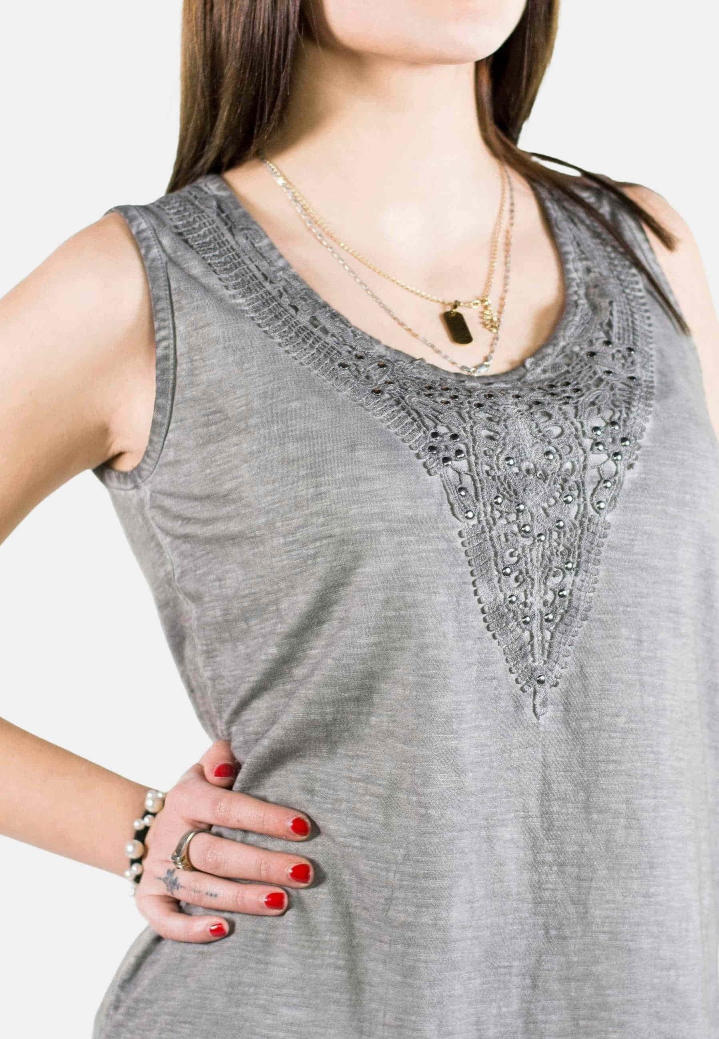 Top de efecto garment dyed. Escote redondo. De tirantes. Crochet en el cuello con detalles metalicos. Color Gris. Composición 100% algodón.